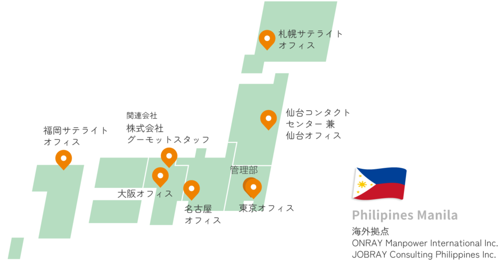 | 関連会社 | 株式会社グーモットスタッフ 〒529-0426 滋賀県長浜市木之本町黒田2876 コージーコートA103 TEL:0120-355-899 HP:https://gms-jinzai.com/ ONRAY Manpower International Inc.(フィリピン) U-801 The Pearlbank Centre 146 Valero Street, Salcedo Village Bel-Air, Makati City, 1209 TEL:(+632) 5310 5520 JOBRAY Consulting Philippines Inc.(フィリピン) U-801 The Pearlbank Centre 146 Valero Street, Salcedo Village Bel-Air, Makati City, 1209 TEL:(+632) 5310 5520 |